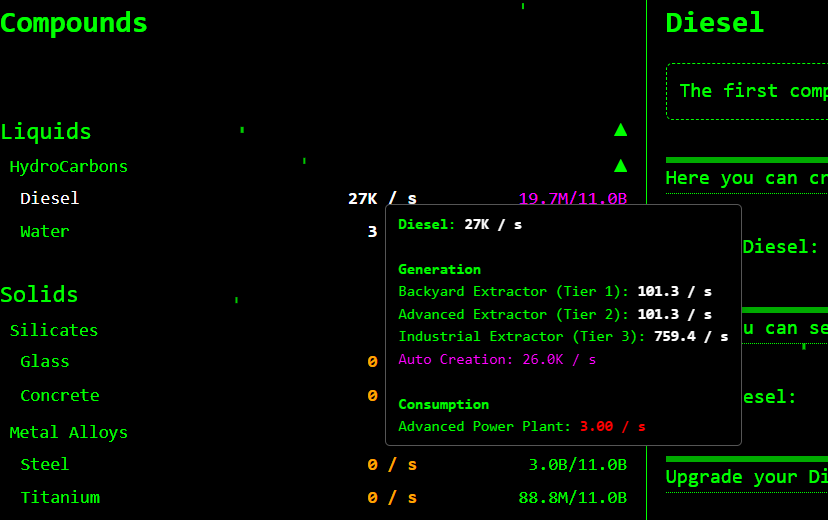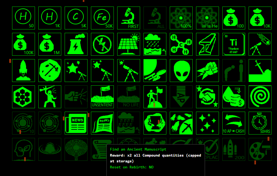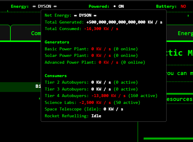 There are a couple (understatement of the century!) of new QoL features. You can now see in tooltips the breakdown of all power generation and consumption, so you know exactly what is being generated where. There is an auto buyer to work through the research tree once bought it will take care of repeating the tech tree each run. There is a Space Telescope auto mode too, so you can pick the search from a drop down and toggle the switch and it will just keep repeating that type of search until you tell it otherwise. The sidebars on each tab now have useful information some of which can be hovered to get more information. The tech tree has been redone from scratch, using native JS instead of the graphViz library, which was something I wanted to do for a while, and plays now much better.